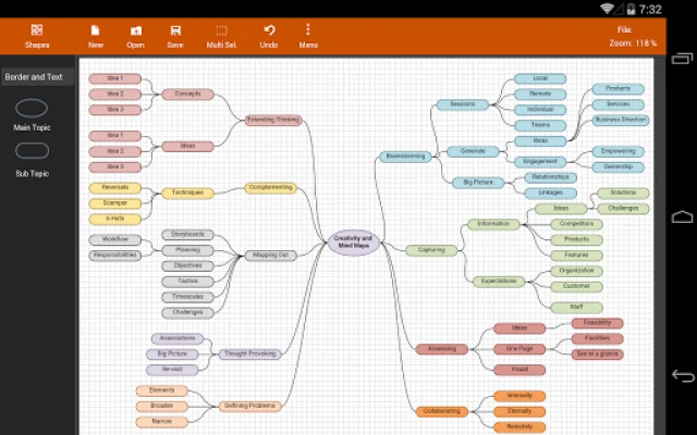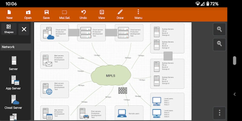 The app is designed with ease of use in mind. You can quickly connect flowchart shapes by simply selecting the start and end connection points and quickly add new lanes to a swimlane diagram or new sub-topics to a mind map diagram by using "+" button from the selected swimlane or mind map shape menu. The mind map sub-topics are automatically positioned on the page but can be easily moved as required.